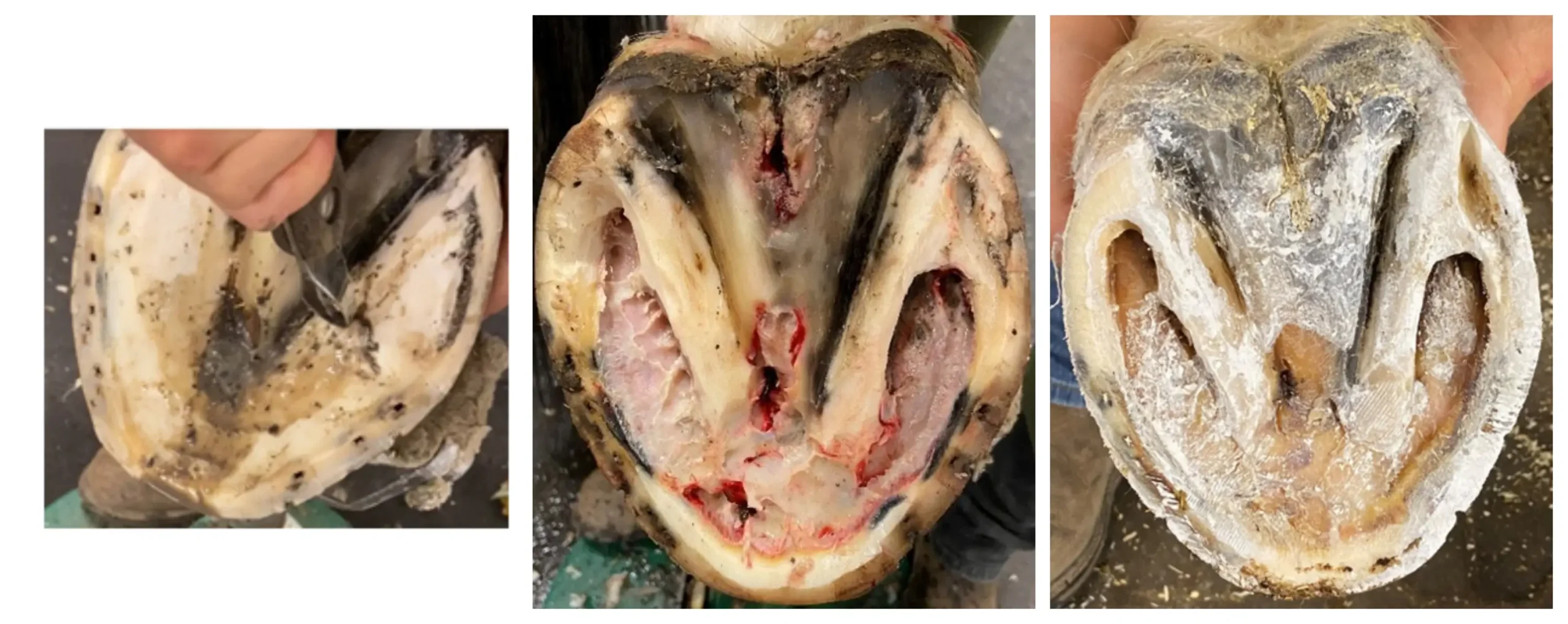 Med hovkniv skärs hoven upp där man har misstanke om hovböld. På bilden i mitten är bölden tömd och en dubbelsula blottad. Böldens innehåll hade spridit sig i sulhornet och skapat en dubbelsula. Bilden till höger är tagen 1 vecka efter det att bölden dränerades och hästen kan nu arbeta fullt ut när skodd med sko + sula + tjärdrev eller Sole pack mellan den egna sulan och sko-sulan. Foton: Ove Wattle