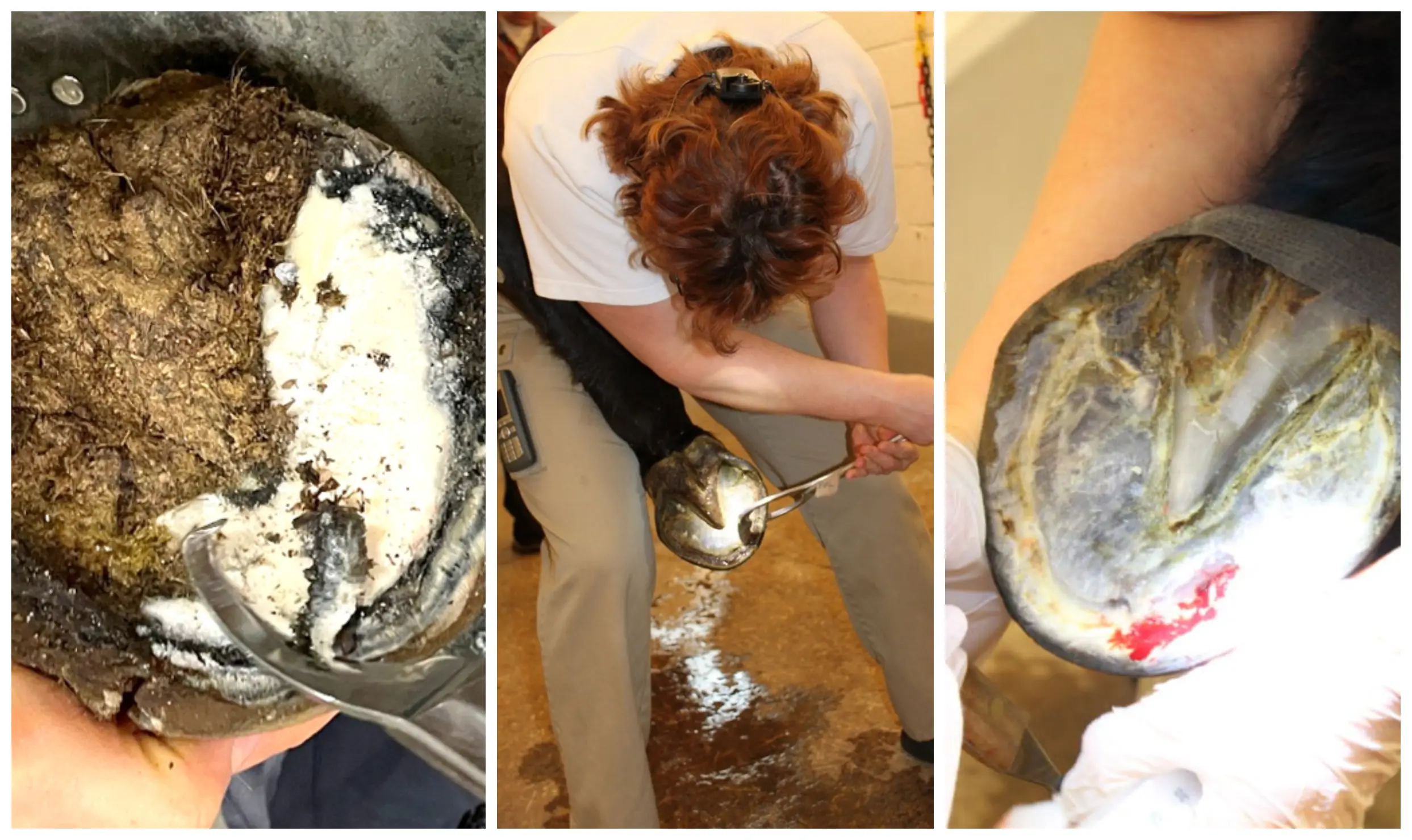 Med hovkniv skärs hoven upp där man har misstanke om hovböld. På bilden i mitten är bölden tömd och en dubbelsula blottad. Böldens innehåll hade spridit sig i sulhornet och skapat en dubbelsula. Bilden till höger är tagen 1 vecka efter det att bölden dränerades och hästen kan nu arbeta fullt ut när skodd med sko + sula + tjärdrev eller Sole pack mellan den egna sulan och sko-sulan. Foton: Ove Wattle