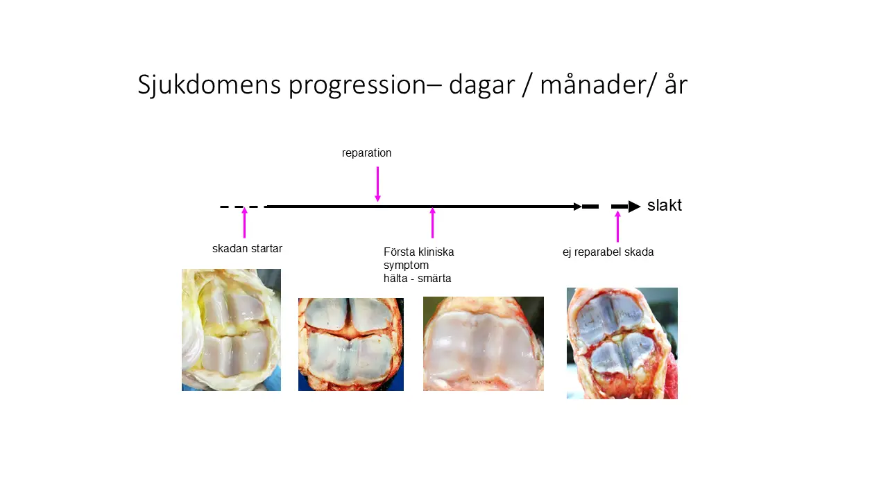 Gör med fördel regelbundna hälsocheckar på klinik, och sök veterinär om du tycker att hästen ändrat beteende/visar ovilja etc, för att upptäcka tidiga tecken på ledskada. Om du tar hästen till en klinik ger det ofta bättre förutsättningar för en utredning än hemma i stallet.