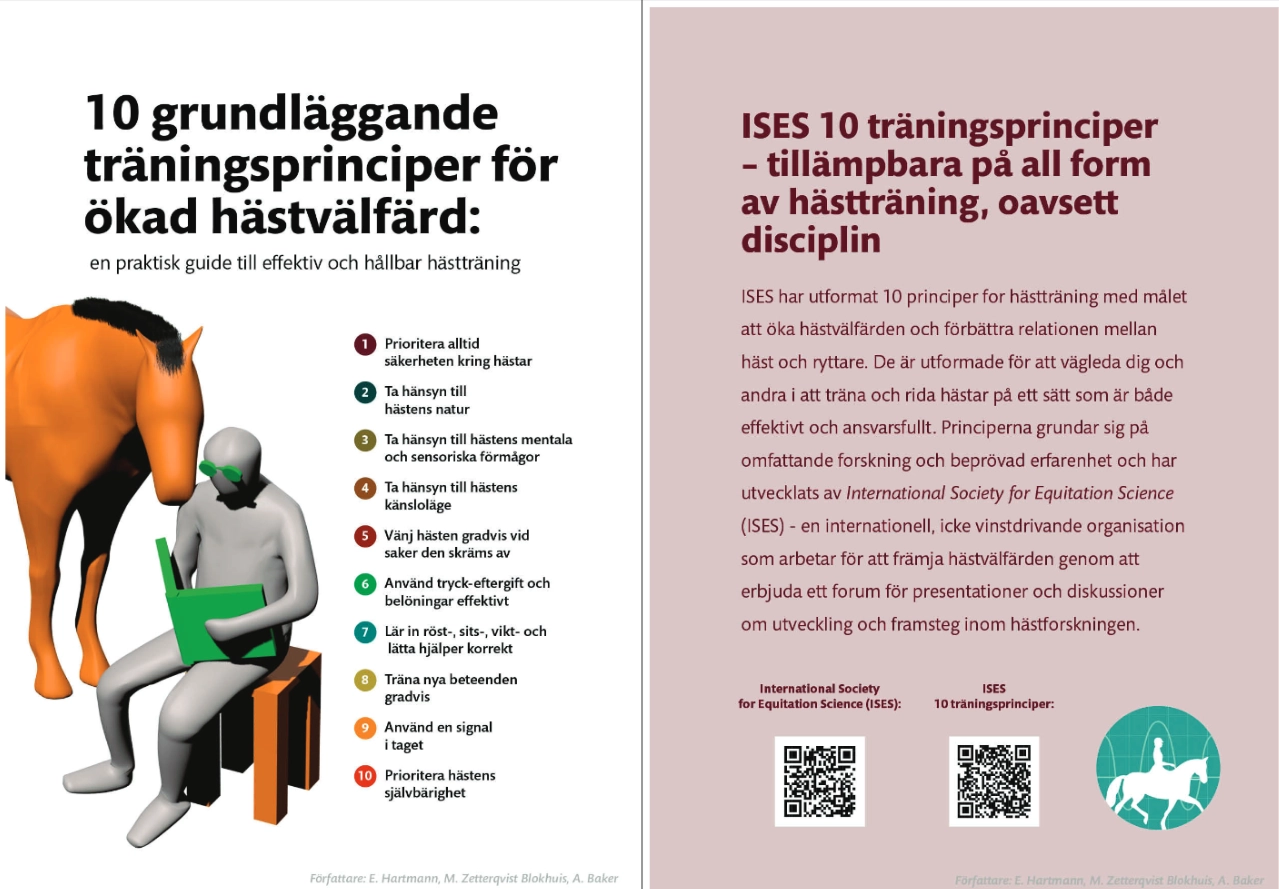 För att underlätta lärandet har utbildningskort tagits fram, baserade på ISES 10 träningsprinciper. Principerna valdes eftersom de är evidensbaserade, ger en tydlig struktur för träningen och kompletterar Fem Domän-modellen för hästvälfärdsbedömning. De lyfter särskilt fram vikten av att beakta hästens natur, känslor och kognitiva förmågor för att stärka kommunikationen och säkerställa att träningen sker ansvarsfullt med hästens välfärd i fokus.